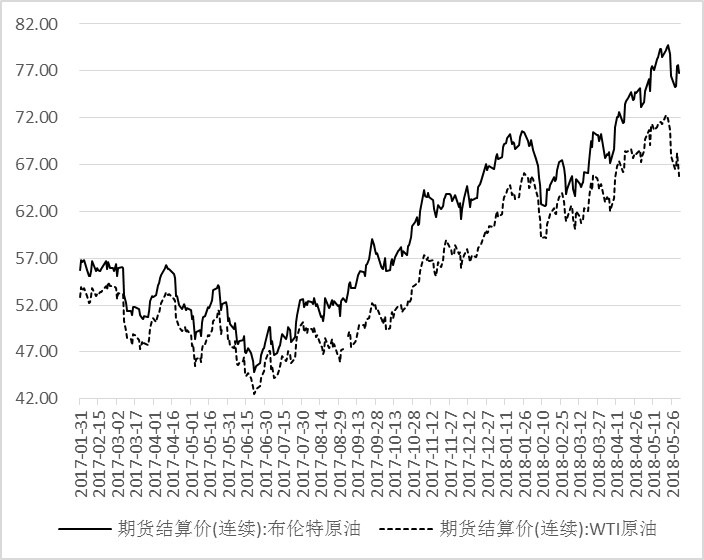 图4 2017年1月~2018年6月1日布伦特原油和WTI原油期货结算价走势图(数据来源:IPE和NYMEX,数据单位:美元/桶)