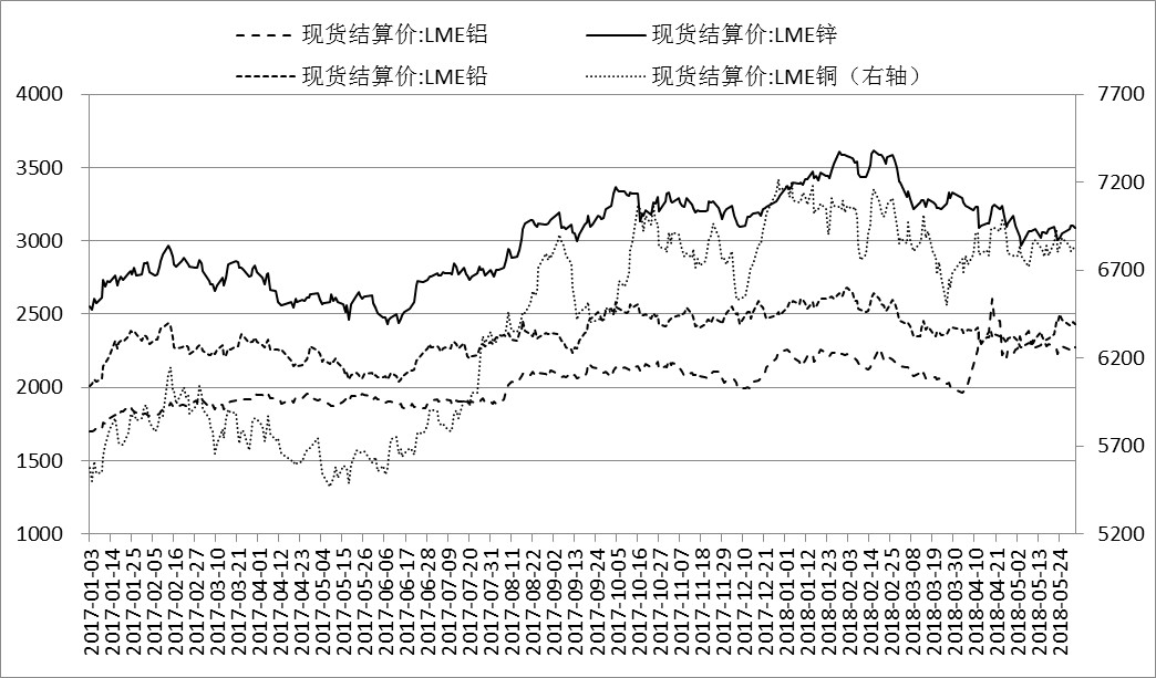 图2 2017年1月~2018年6月1日LME铜、铝、锌、铅、镍现货结算价走势图(数据来源:LME,单位:美元/吨)