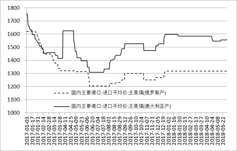 图1 2017年1月~2018年6月1日国内主要港口焦煤价格走势图(数据来源:万得,单位:元/吨)